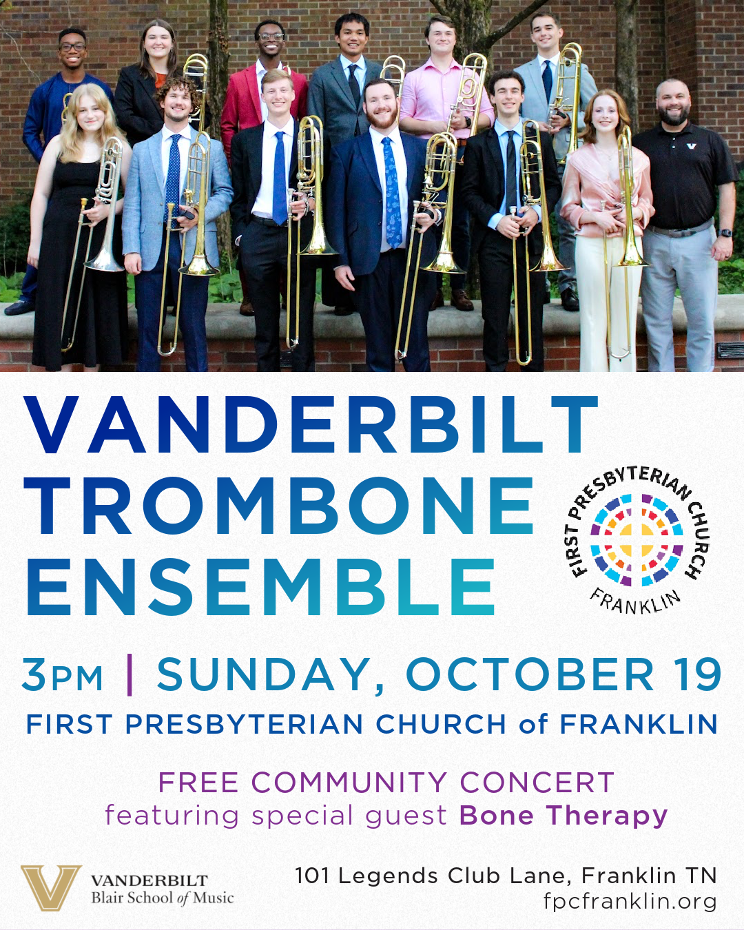 Join the Vanderbilt Trombone Ensemble for a free community concert at First Presbyterian Church of Franklin on Sunday, October 19th at 3 PM, part of the church's Music-Worship & ARTS Series.